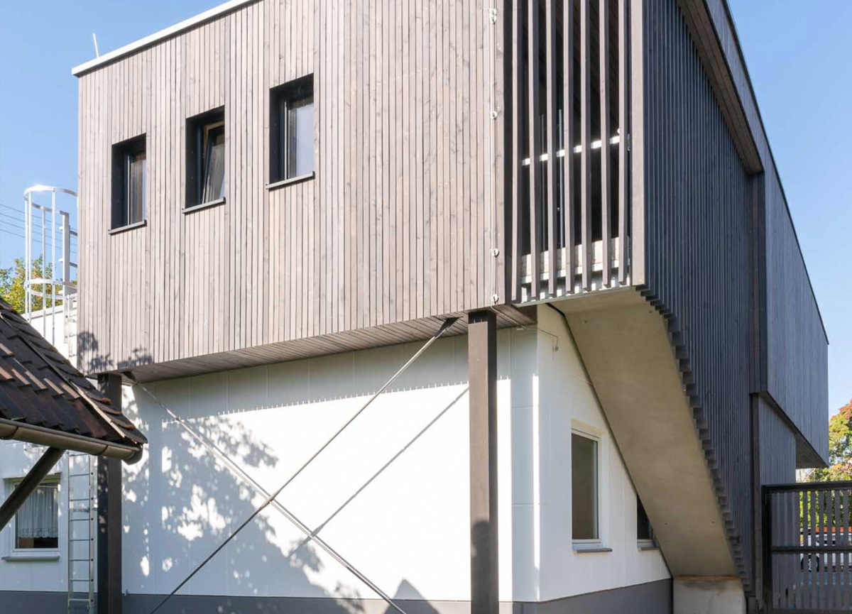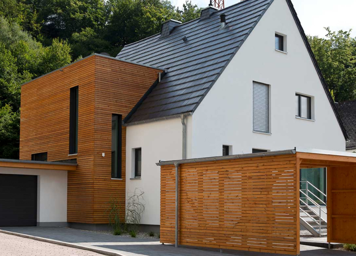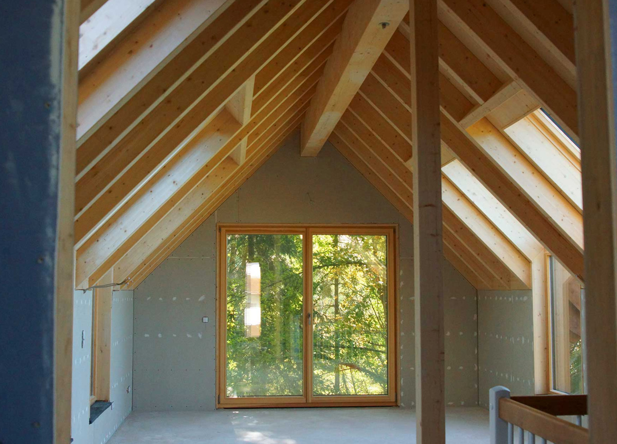 Der Umbau und die Erweiterung von bestehenden Bauobjekten, z.B. in Form einer Aufstockung, ist aktueller denn je. Gerade hier ist die Holzbauweise ideal. Holz besitzt trotz seines geringen Eigengewichts eine hohe Tragfähigkeit, so dass die hinzukommenden Lasten problemlos vom bestehenden Objekt getragen und teure Verstärkungen gespart werden können. Auch Umbauten im Innenbereich, z.B. Türdurchbrüche bei Anbauten, lassen sich problemlos durchführen, da der komplette Innenaufbau der vorgefertigten Wand- und Deckenelemente, wie Streben, Versorgungsleitungen usw. millimetergenau lokalisiert werden können.